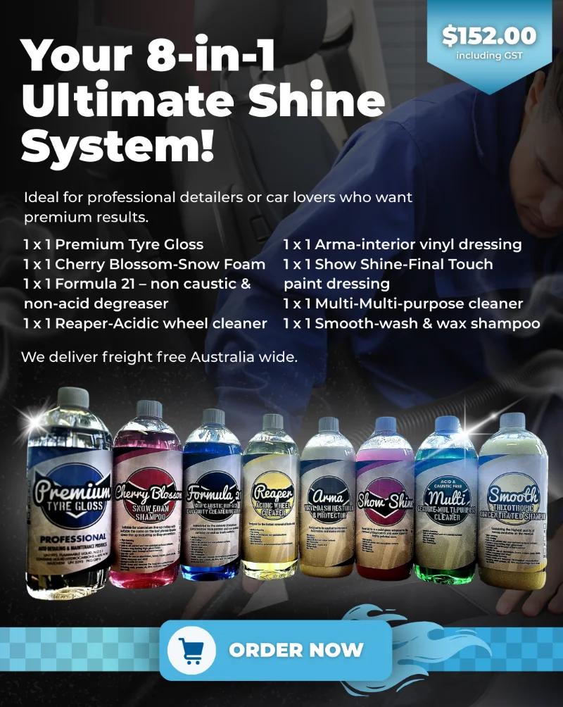 Search Search content Clear Range Range AccessoriesAerosol CansBlades and Steel WoolBottles and TriggersBrushes and PolesBuff Pads & Applicator PadsClay Blocks and Nano PadsDecanting & Dispensing EquipmentMicrofiber / Chamois / Drying TowelsPaper ProductsVacuums & AccessoriesAir FreshenersAllApplicator PadsBest SellersBrandsAuto GlymAutosolCalifornia CustomCartecComplete Carwash ProductsKovalent CoatingsBug and Tar RemoverCafe CleanersCarpet CleanersDegreasersDeoderisersExterior WashFall Out RemoversHand CleanersInterior DressingsLaundry CleanersMulti Purpose CleanersPaintPaint SealantsPolishes and CompoundsRags & NappiesSealantsSolventsSponges & Car Wash MitsTyre DressingWheel AcidWorkshop Cleaners 1LT TRIM – Professional Trim Dressing200L Drum Pump Plastic200L Drum Spanner Metal200L Drum Stand20L Drum Pump20L Drum Spanner Plastic20L Mop Bucket5L Drum Pump8-in-1 Ultimate Shine SystemAerosol PaintAerosol ShowshineAir San CanAlbright Pre-Soak and SanitizerAluminium HandleAnti-Tobacco DeodoriserApplicator Pads CottonApplicator Pads Foam – pkt-4ArmaARMA – Silicone Emulsion Base Interior And Rubber DressingAuto Glym ChamoisAuto Glym Leather & Trim Conditioner – 1LAuto Glym Radiant Wax – 5LAutosol – 1kgB80 Woolen Buff PadsB90 Woolen Buff PadBACTOSAN Multi Purpose CleanerBathmaidBig Blue Polish – 5 LitreBig ChanceBIG CHANCE Multi Purpose CleanerBlack Degrease – Caustic HD Multi Purpose DegreaserBlack Pearl Polish – 5 LitreBlades USABleach Industrial Strength 12.5%Blend CentreBottle – 1LBottle – 500ml ConicalBottle – 500ml long NeckBottle – Polish DispenserBottle – Pressurized 1L Load more (203)